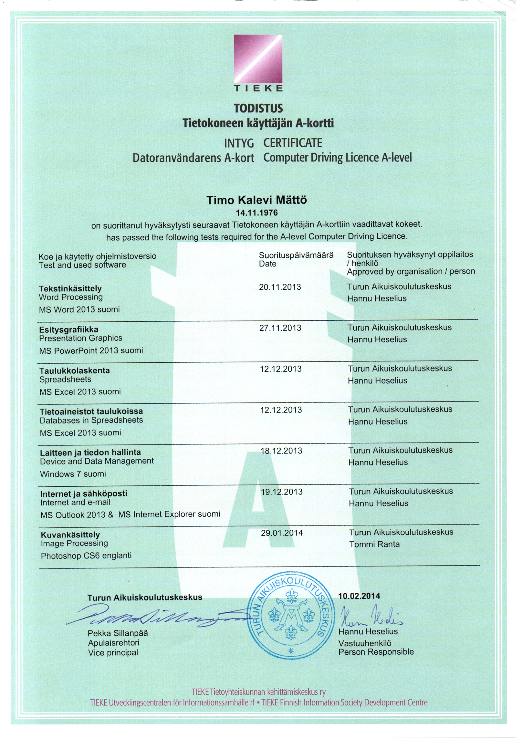 Kurssia ei suoritettu loppuun koska lähdin töihin Eurooppaan. Osallistuin myöhemmin uudelleen vastaavalle kurssille ja suoritin ammattitutkinnon.